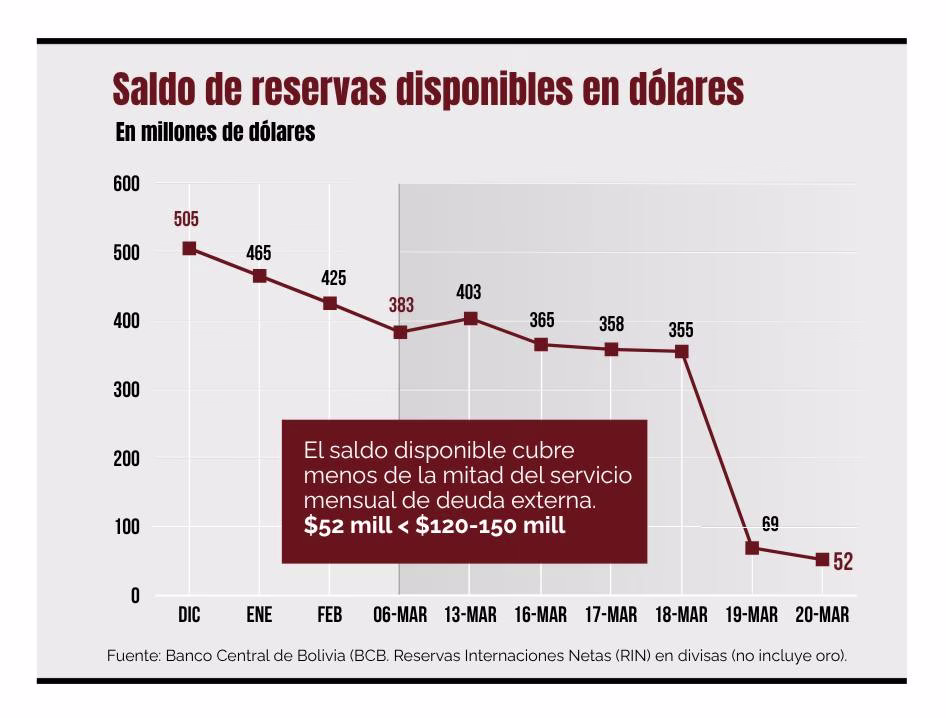 La pregunta de Colque es directa y no tiene respuesta oficial: “A propósito, ¿dónde estarán los 10 millones diarios de dólares ahorrados?”. La evidencia sugiere que ese ahorro fue insuficiente para frenar la salida de divisas, el Banco Central se queda con solo $us 52 millones.