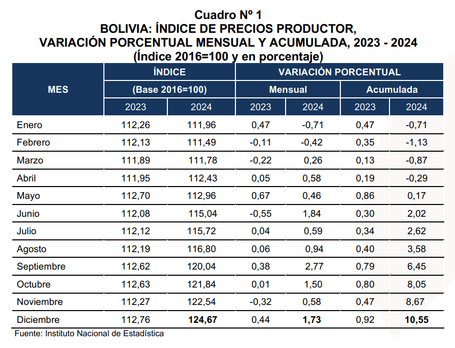 Los productos con mayor incidencia en el aumento del IPP incluyen la soya, el aceite crudo de soya, la hoja de coca, el maíz y la castaña. Mientras tanto, productos esenciales como la papa, la leche y la plata metálica refinada registraron caídas en sus precios, reflejando una inestabilidad en el mercado.