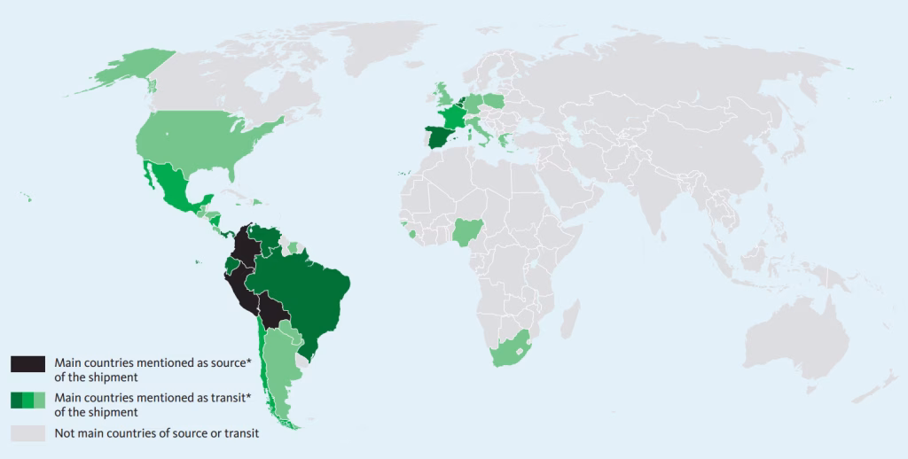 Rutas Terrestres y Aéreas de Alta Frecuencia: La droga sale de Bolivia hacia Brasil, Paraguay, Chile y Argentina. Salida al Mundo: A través de estos países, la cocaína boliviana se integra a los flujos de alto volumen que se dirigen a Europa (el nuevo principal destino) y América del Norte en menor medida donde la cocaína colombiana es la más común. Venezuela sí es un país de tránsito, pero para la cocaína que parte de Colombia. Cuba, por su parte, ni siquiera es mencionada en los flujos de tráfico específicos.