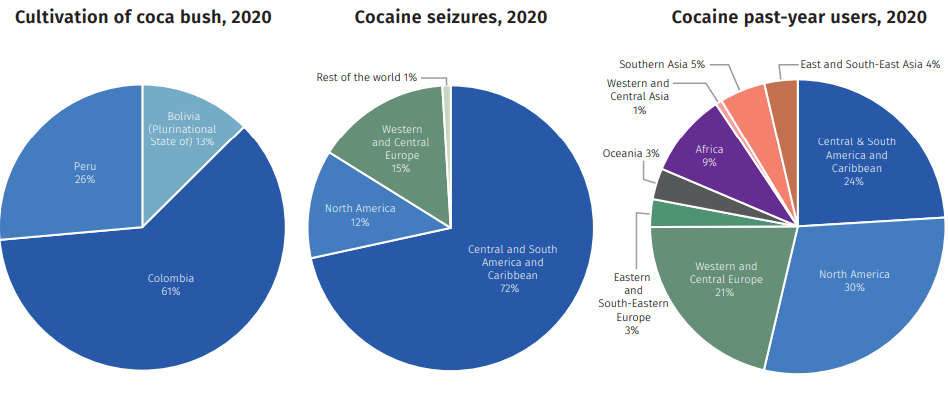 La cocaína boliviana no llega a EEUU como presumen muchas personas, medios y políticos ignorantes, tiene otros mercados y destinos. Es decir que EEUU no tiene problemas con la cocaína boliviana. Pero, a dónde llega. La UNODC (United Nations Office on Drugs and Crime), realizó en 2023 el Global Cocaine Report, donde extensivamente analizó el mercado de la cocaína y su impacto mundial.