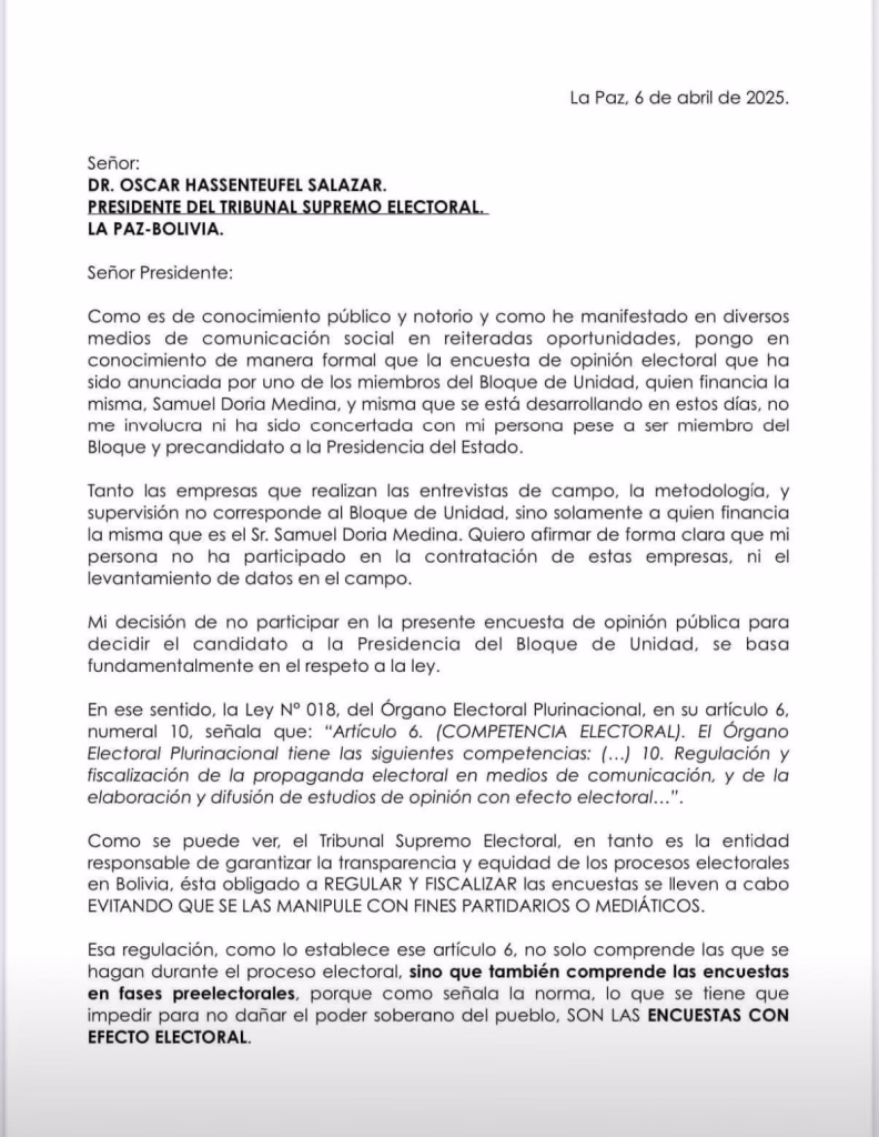 En la carta dirigida al presidente del TSE, Oscar Hassenteufel, Tuto Quiroga deja constancia formal de que no participó en la contratación ni elaboración de la encuesta en cuestión, y solicita que se verifique su legalidad: